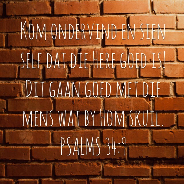 Psalm 34:9 (1983) "Kom ondervind en sien self dat die Here goed is! Dit gaan goed met die mens wat by Hom skuil."